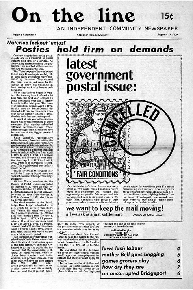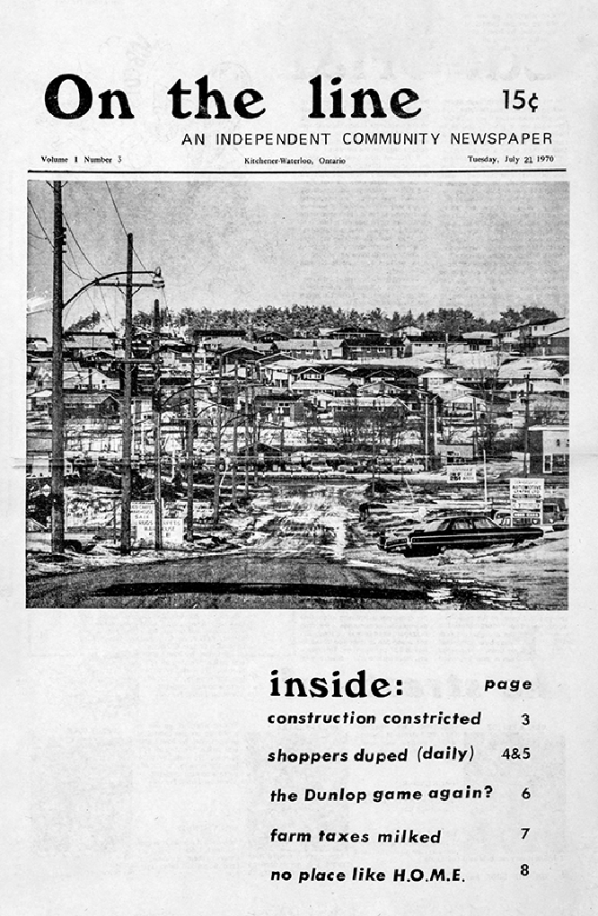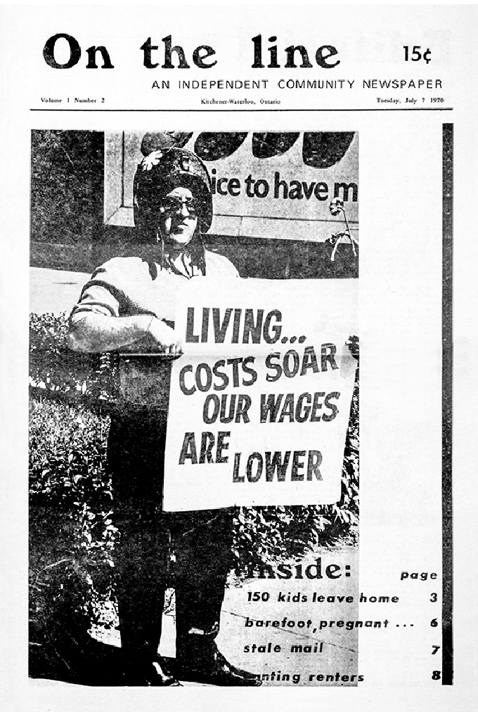 Many grassroots alternative publications emerged from Dumont Press Graphix, but one important community newspaper actually preceeded it. On the Line, one of the early Canadian alternative newspapers, was established by a volunteer collective from the Gabriel Dumont Memorial Commune in Waterloo, started publishing ion June 23, 1970. Within two months, the editorial and production staff had determined that the paper needed to establish its own typesetting and production resources in order to become sustainable. Nine months and a whole lot of labour later, Dumont Press was born, opening its doors in May 1971.