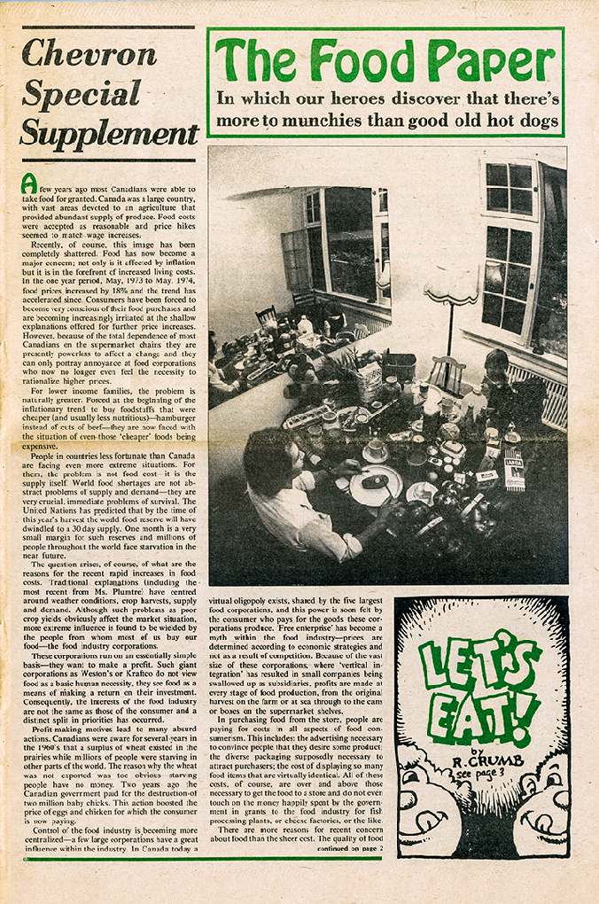 The last hurrah was in summer 1974. I was involved with an OFY-funded project on temporary farm workers. Terry Moore, David Robertson, David Cubberley, Mel Rotman, and more of the usual suspects were involved. 12 of us I think. Finally we split into 2 groups: I was with the one on the political economy of food in Canada—which produced a corporate map of the ownership structure of Weston’s that was suppressed by the Montreal Gazette. I remember a consultation with Leo Johnson where he generously shared his method of estimating surplus value with me. The other was a photo-journalism project on the farmworkers themselves. The last was published in The Chevron and a local paper called The Kitchener-Waterloo Free Press that we started up that summer.